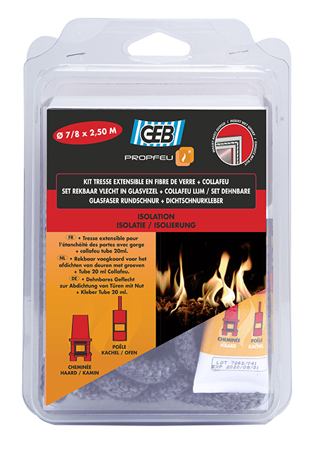 Complete kit voor de thermische afdichting van inzethaarden, verwarmingsketels, kachels, haarden, enz. bestaande uit een rond glasvezelkoord + vuurvaste lijm voor deuren met naden.