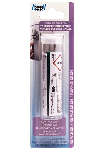 Snijd de gewenste hoeveelheid kit af en verwijder de beschermfolie. Meng met de hand totdat u een uniforme kleur verkrijgt (1 tot 2 minuten). Breng het mengsel binnen 10 minuten aan door het stevig op het te repareren oppervlak aan te drukken en door het in de scheuren of zichtbare holtes te laten binnendringen. Behandel over 2 cm extra aan weerszijden van het te repareren gebied. Snijd overtollig product af, bij voorkeur met een vochtig gereedschap. Strijk voor een glad uiterlijk onmiddellijk na het aanbrengen en voor het uitharden met de hand of met een vochtige doek glad. Wacht minimaal 3 uur voor volledige uitharding.