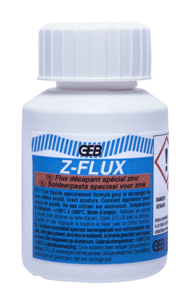 Gebruiksaanwijzing : Breng Z-FLUX aan met een kwast. Na mat worden van het zink, verwarm het stuk met een soldeertang om de soldeer te laten smelten. Veeg het teveel aan soldeer en afbijtmiddel af met een vochtige doek. Voor het schoonmaken van de soldeertang adviseren wij u om onze SEL AMMONIAC te gebruiken.