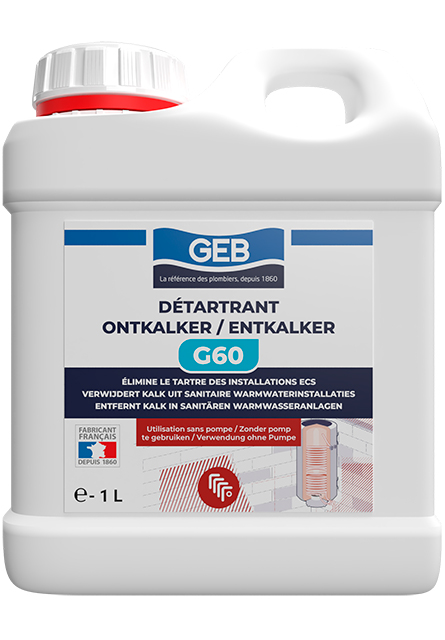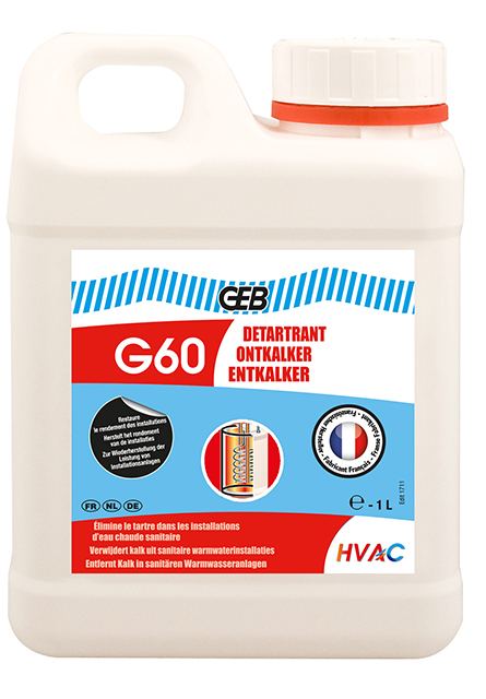 Le G60 DETARTRANT est un liquide d’entretien des installations sanitaires d’eau chaude. Il élimine les bruits au niveau des chauffe-eaux. à utiliser pur ou dilué pour dissoudre le tartre dans les installations en acier, fonte, acier galvanisé, cuivre, laiton et/ou acier inox. Ne pas utiliser sur les circuits en aluminium.