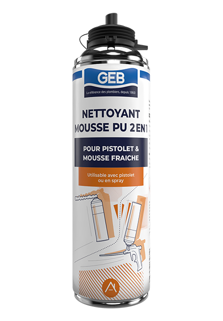Nettoyant pouvant à la fois se visser sur les pistolets pour mousse pistolable pour les nettoyer et être aussi utilisé comme aérosol pour nettoyer les résidus de mousse fraîche.