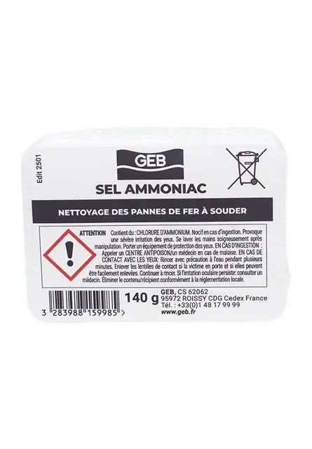 Sel d’ammoniac en pain, destiné au nettoyage des pannes de fer à souder. De couleur blanche. Dimensions : 65 mm x 45 mm x 38 mm.